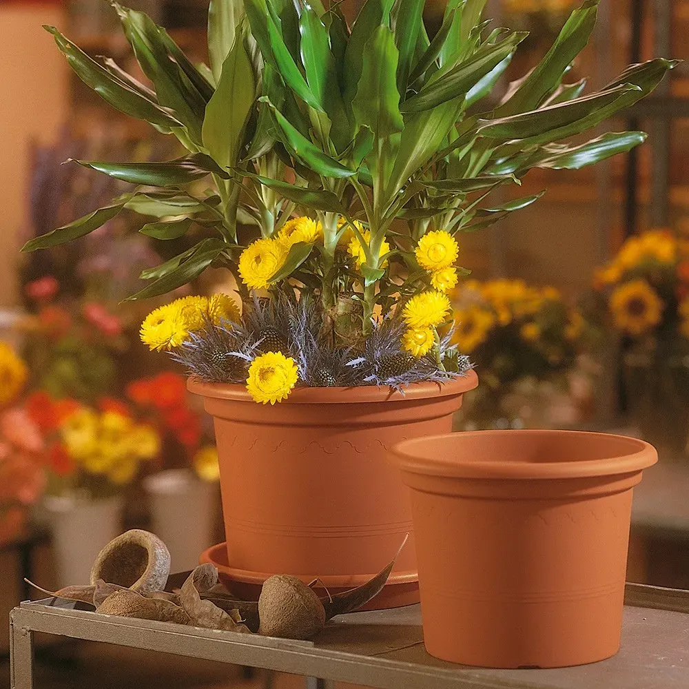 In einer Vielzahl von Farben erhältlich ist der Pflanzentopf GEO von euro3plast mit seiner klassischen Form ein vielseitig einsetzbarer Topf für Ihren Garten. Sie wollen Ihren Garten in mediterranem Stil? Mit ein paar kleinen Zitrusbäumen und mit Oleander bepflanzten GEO in Terra die Siena bringen Sie etwas Urlaubsfeeling in Ihren Garten. Aber nicht nur im Außenbereich ist der GEO Pflanzentopf durch seine Stoßfestigkeit sowie UV- und Temperaturbeständigkeit eine ausgezeichnete Wahl, denn mit einem passenden Untersetzer der Serie MEDEA kann er auch problemlos für den Innenraum verwendet werden. Zusätzlich dazu besteht dieser Topf aus zu 100% recycelbarem Polypropylen (PP).