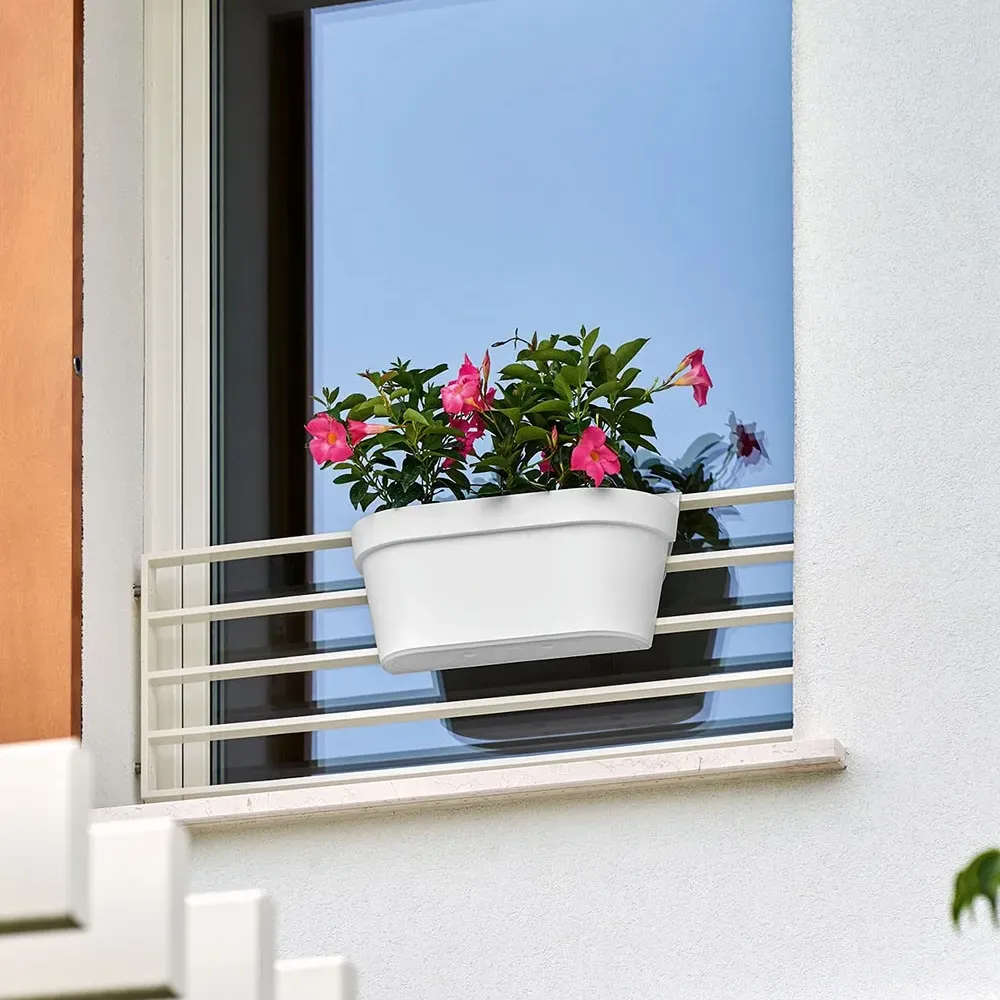 Verschönern Sie Ihren Balkon mit dem UP Geländer-Pflanzkasten von euro3plast. Hier ist keine Montage notwendig, der Topf kann einfach über das Geländer gehängt werden, solange dieses nicht breiter als 5 cm ist. Ausgestattet mit einem Überlaufsystem das gleichzeitig wie ein Wasserspeicher funktioniert sind Ihre Pflanzen vor Überwässerung geschützt und zusätzlich für einige Tage selbstständig mit Wasser versorgt. Der UP Pflanzkasten ist aus Polypropylen und dadurch UV- und Temperaturbeständig sowie Stoßfest, so haben Sie einen langlebigen und dadurch nachhaltigen Geländer-Pflanzkasten um Ihren Balkon mit den verschiedensten Blumen und Kräutern zu begrünen.